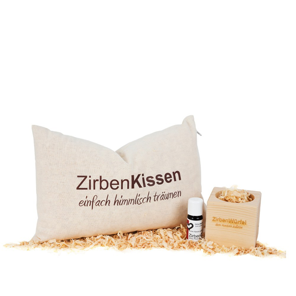 Zirbenfamilie Gute Nacht Set Zirbenkissen Zirbenwürfel Zirbenöl 10ml