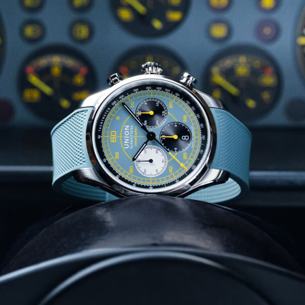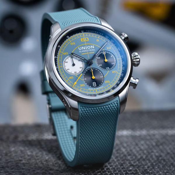 Der neue Belisar Chronograph Limitierte Edition Speedster 2025 ist inspiriert von einem seltenen italienischen Rallye-Straßenfahrzeug der 1980er Jahre – einem automobilen Original, das für Performance, Stil und technische Innovation steht. Die Kombination aus mattem Blaugrau und kräftigem Gelb verleiht der Uhr eine moderne, sportliche und zugleich elegante Ausstrahlung. Die Farbwahl ist bewusst außergewöhnlich – sie steht für Dynamik und Individualität. Gelbe arabische Ziffern, ein zentrales Fadenkreuz sowie die Tachymeterskala unterstreichen den Rennsport-Charakter des Modells. Die Zeiger sind in PVD Schwarz gehalten und bilden dadurch einen starken Kontrast. Statt einer klassischen Nummerierung zeigt das Zifferblatt Sekundenintervalle – ein subtiler Hinweis auf das stilistische Vorbild der Uhr. Das graublaue, strukturierte Kautschukarmband greift die Zifferblattfarbe auf und erinnert in seiner Textur an die Oberflächen italienischer Armaturenbretter. Ergänzt wird das Modell durch ein Wechselarmband aus Leder, das dem Träger zusätzliche Styling-Optionen bietet.